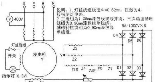 柴油發(fā)電機(jī)組實(shí)質(zhì)是臺(tái)三次諧波自勵(lì)磁凸式三相四線同步發(fā)電機(jī),因具有輸出功率大、適合移動(dòng)等優(yōu)點(diǎn),故廣泛用于廠礦、工程施工等場合。雖然功率不同的發(fā)電機(jī),其繞組數(shù)據(jù)有所不同,但電路連接基本相同。